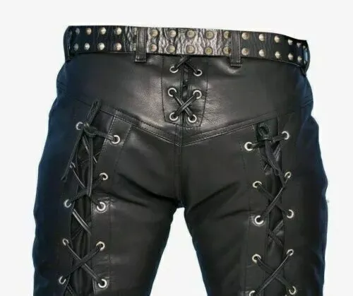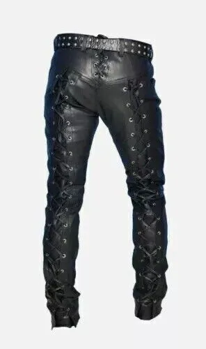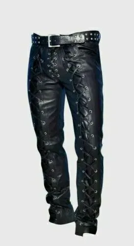 Men’s Black Genuine Leather Pants Real Leather Lace Up Pants Trousers for Men