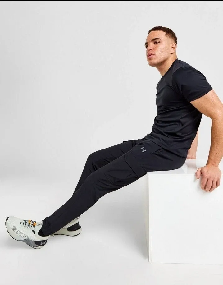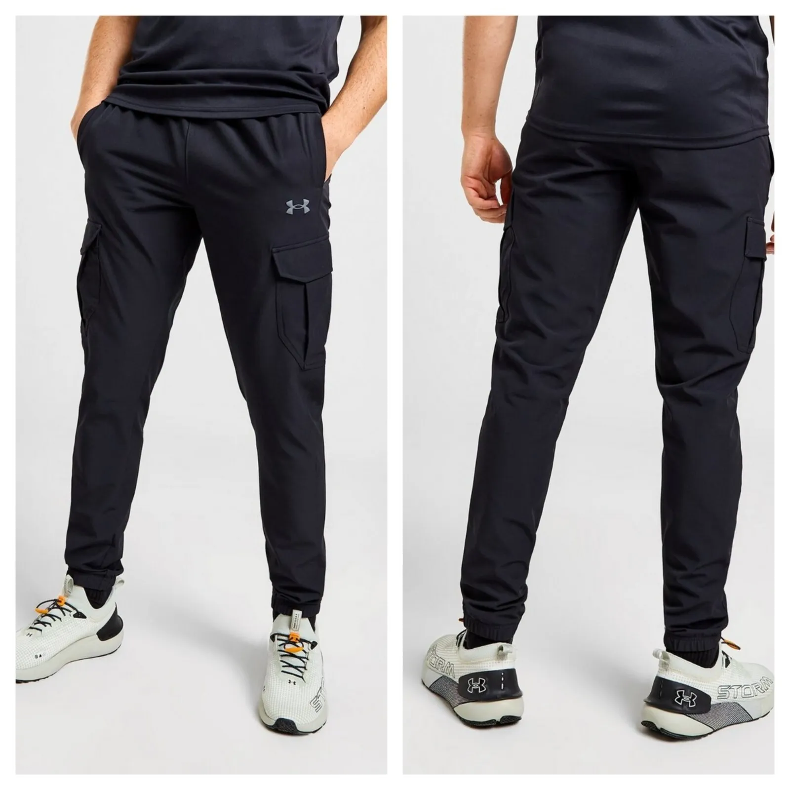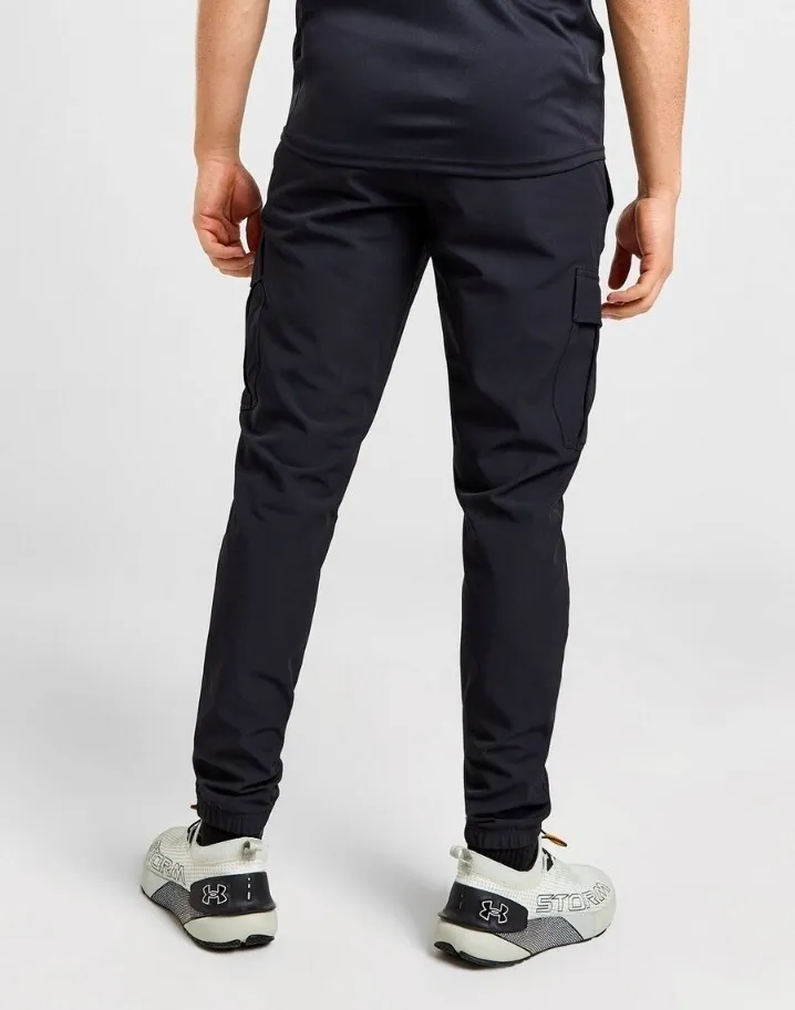 a staple that’s exclusive to JD in these men’s Woven Cargo Track Pants from Under Armour. In a Black colourway, these regular-fit cargos are crafted from an ultra-soft cotton poly blended fabric for all-day comfort. They feature an elastic waistband to bring you a snug, supportive feel, while cuffed ankles let you flex your footwear. With cargo pockets for storage and a utility vibe, they’re finished with the UA logo to the leg. Machine washable. | Our model is 6’0″ and wears a size medium.