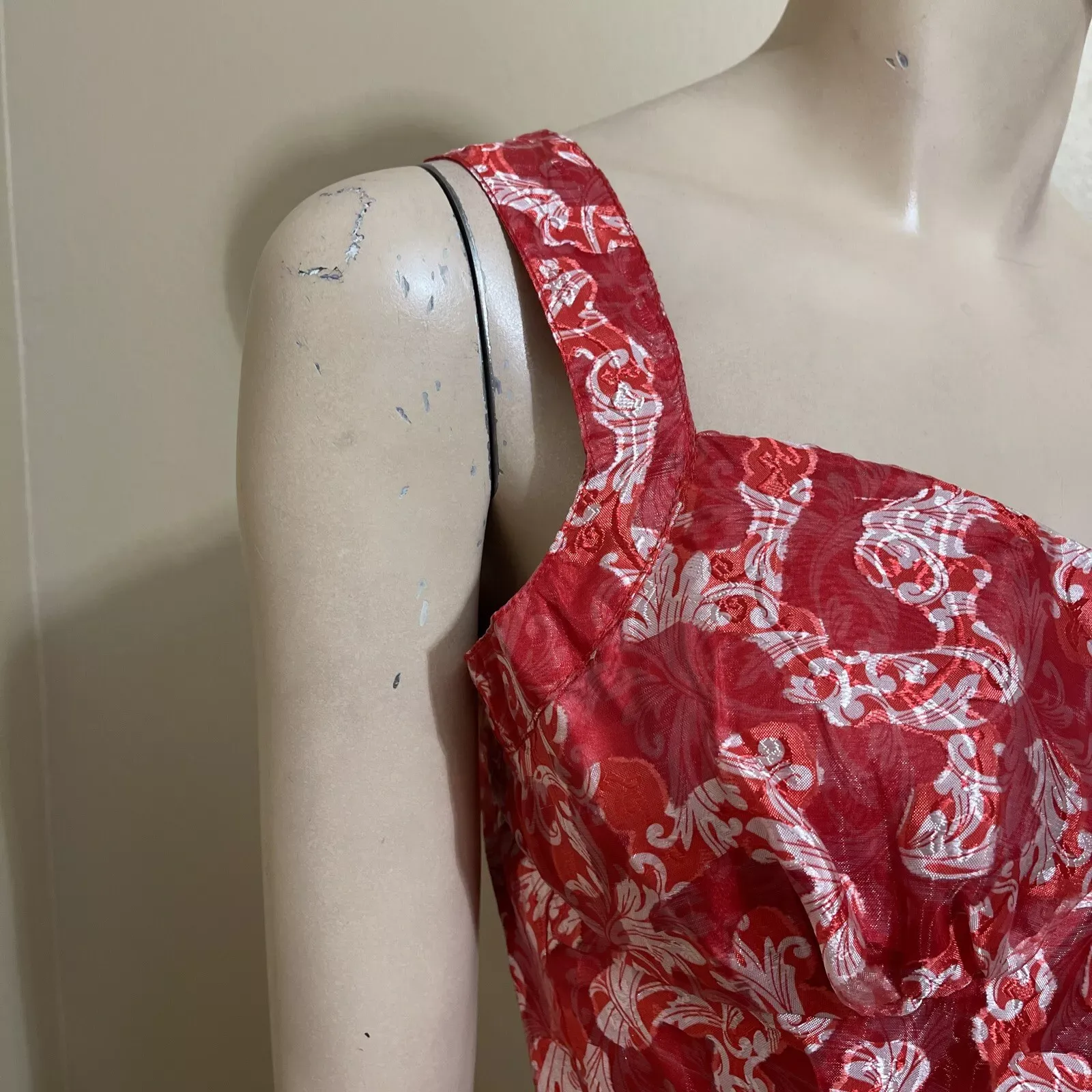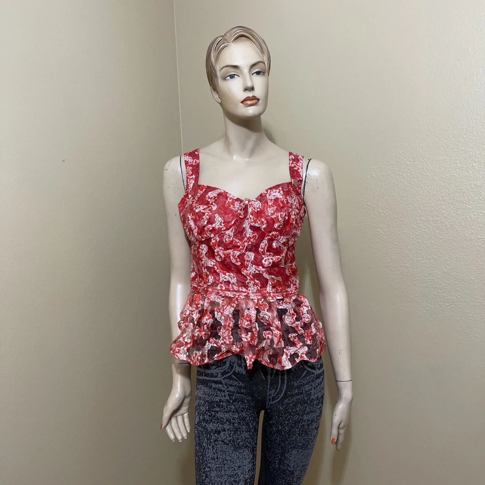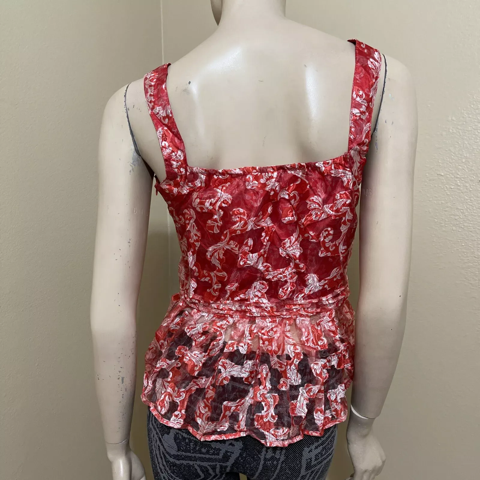 Women’s Red white Floral polyester casual summer open sleeveless layered zipper sheer size L blouse top tunic