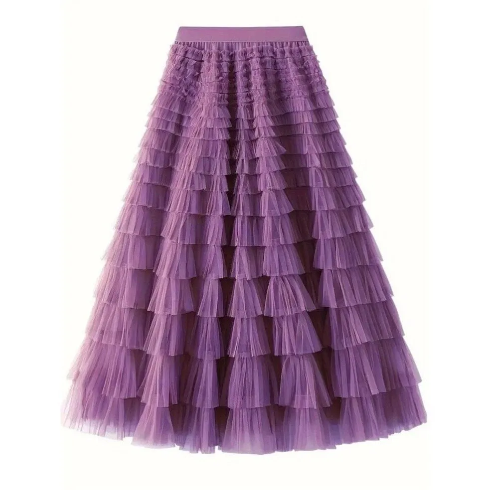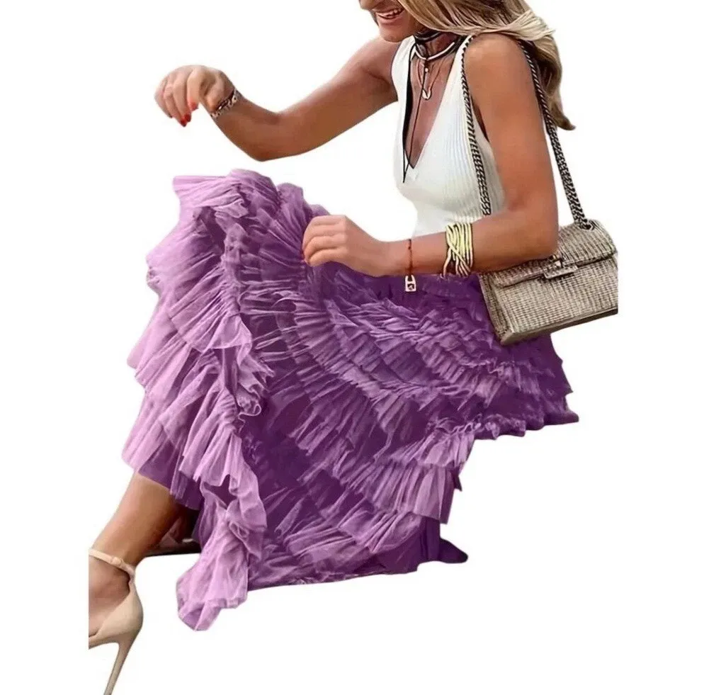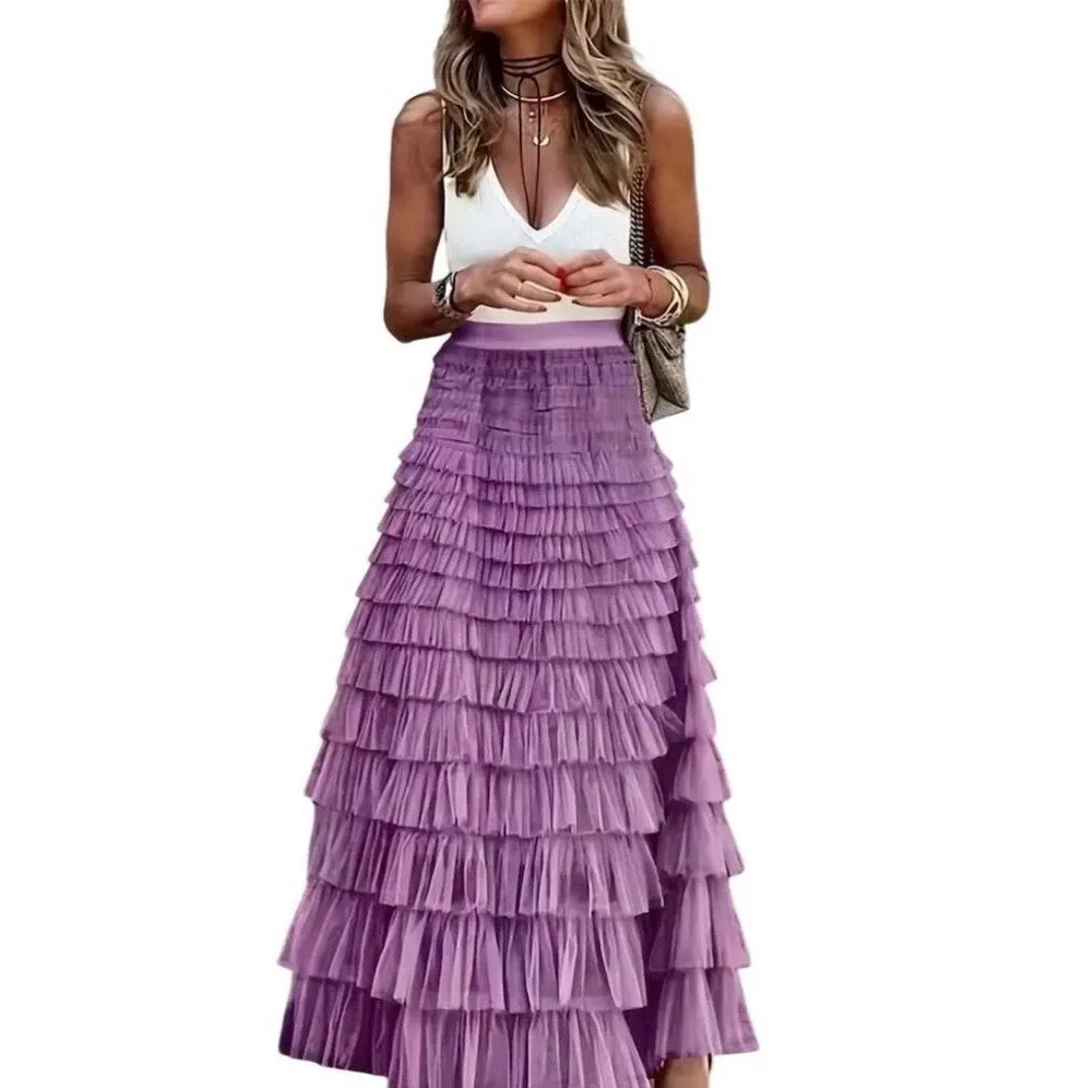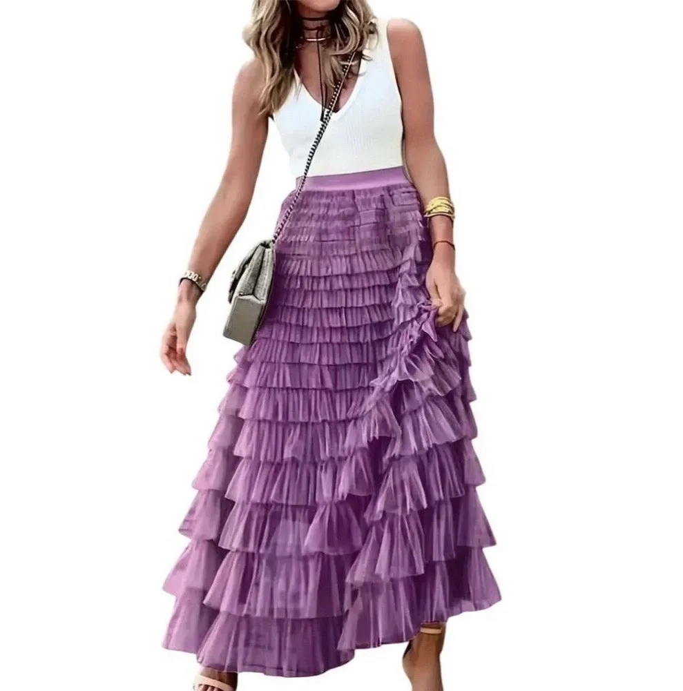 This stunning purple maxi skirt is perfect for any occasion. The high waist and layered ruffle design give it a chic and feminine look that will make you stand out in any crowd. Made from tulle fabric, it features an elastic waist for a comfortable fit and is machine washable for easy care.
